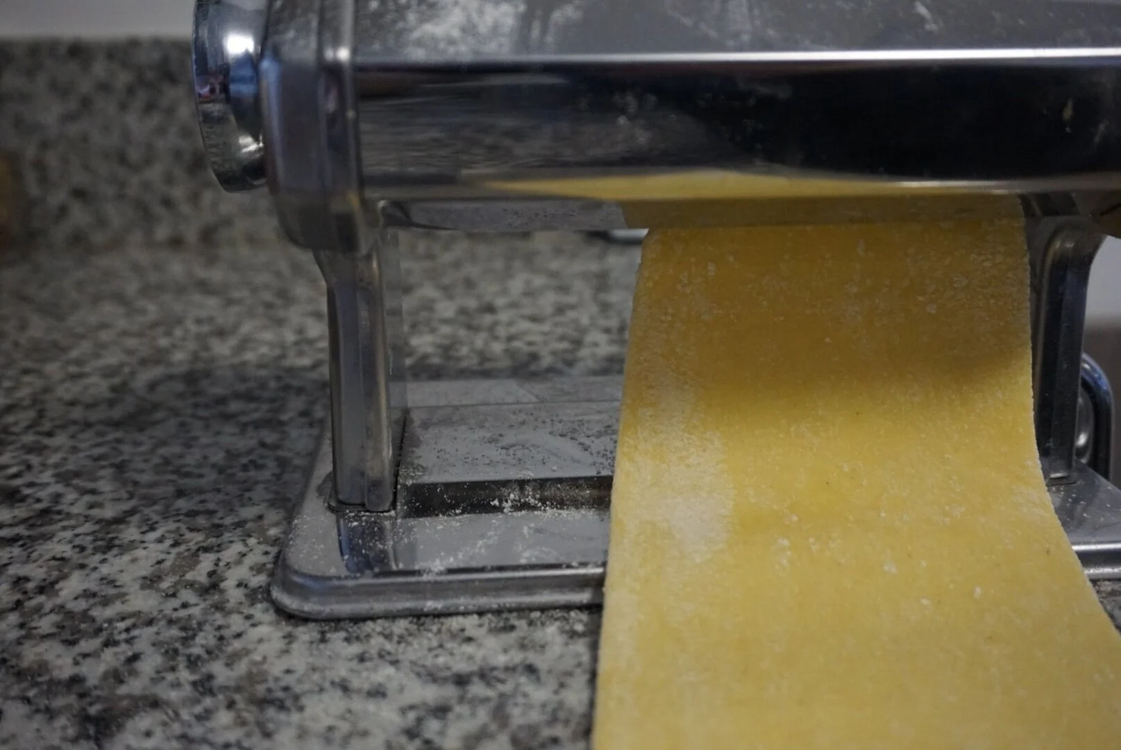 Using a rolling pin, flatten the dough into a rectangle and pass through a pasta machine at its widest setting